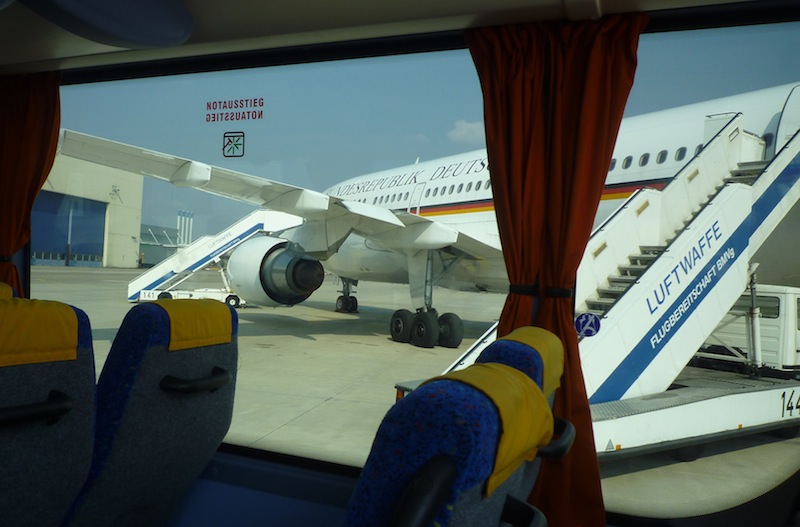 Dann mit dem Shuttlebus zum Flieger, ein Airbus A-310, der "Kanzler-Jet", mit dem auch Angela und diverse Minister hin