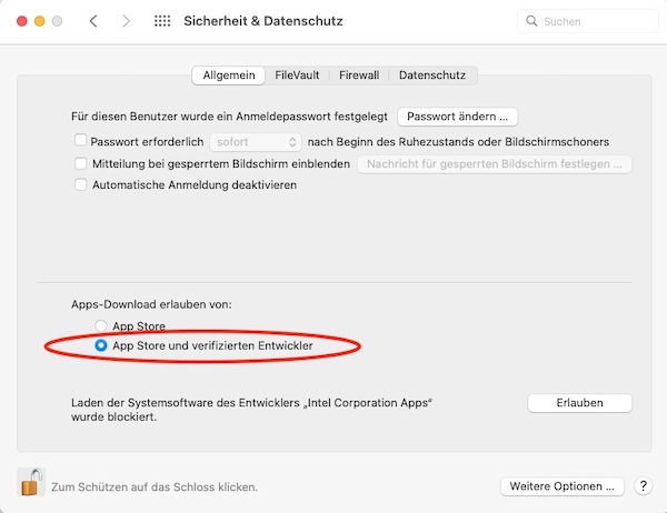 1. In den macOS Systemeinstellungen "Datenschutz & Sicherheit" die angezeigte Option anklicken: