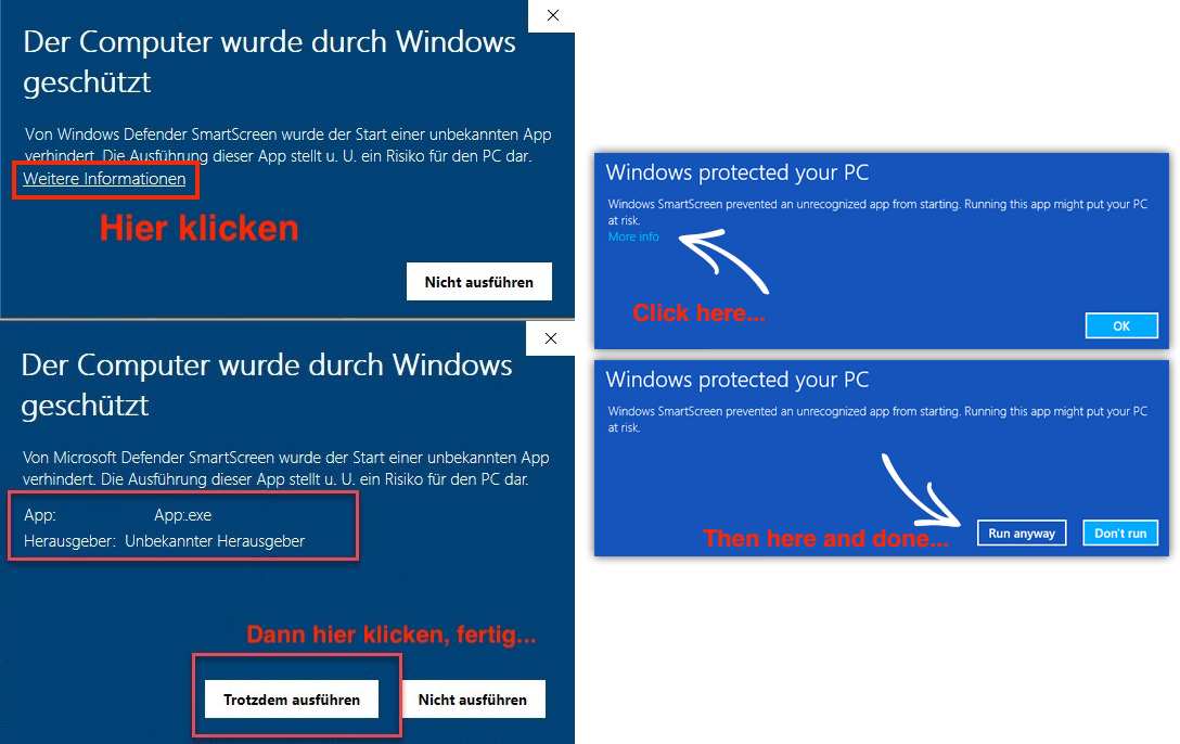 Klicken Sie auf "Weitere Informationen", dort auf "Trotzdem öffnen", fertig..